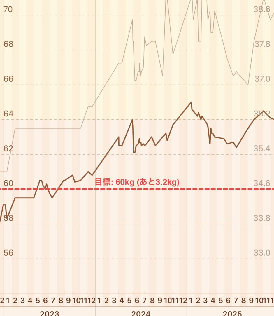 今160cm63Kg。私はもともと太っているから、60kgくらいがちょうどいいところ。