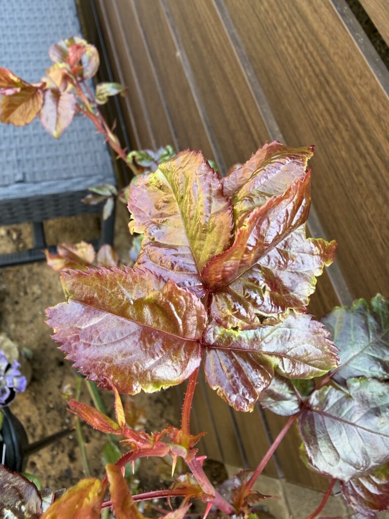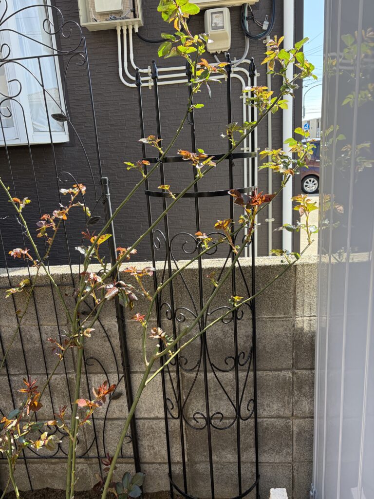 今のところ気になるのは、↑ジャンクリストフの新芽が、縮れて汚い緑が混じること。それと写真はないけど風姿花伝紅の新芽に勢いがなく、薄く縮れてシミがある。ベト病疑いで、ベンレートとスミチオンを散布した。